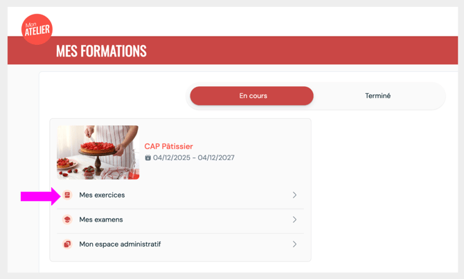 - Sur la formation de votre choix (en cas de multi-formations), cliquez sur "Mes exercices".
