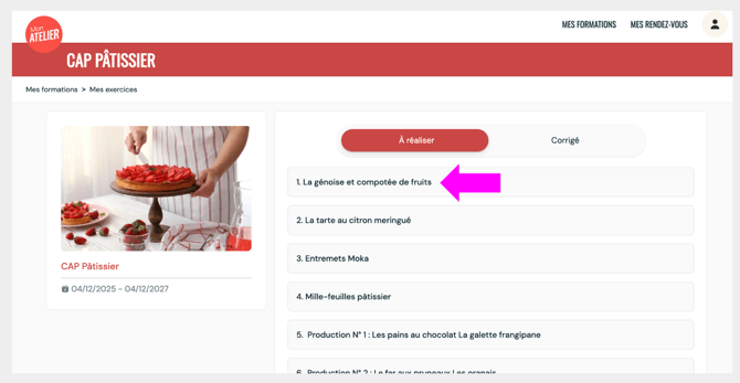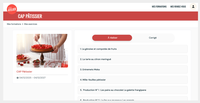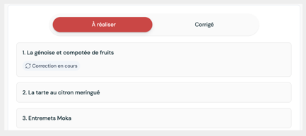 - Retrouvez dans l'onglet "À réaliser" la liste des exercices corrigés restant à réaliser et dans l'onglet "Corrigé" la liste des exercices déjà réalisés et pour lesquels vous avez reçu la correction personnalisée de votre expert.