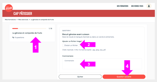 - À gauche (1), vous voyez le nombre de questions de l'exercice et votre progression.