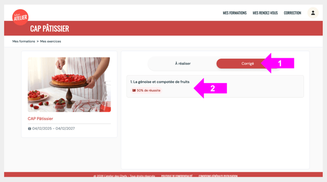 - Dans la formation de votre choix > Mes exercices, cliquez sur l'onglet "Corrigé" (1) puis sur l'exercice en question (2).