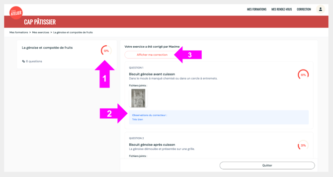 - À gauche, vous voyez votre note globale de l'exercice (1). Le détail de chaque question avec la note et le commentaire du correcteur se situent sur la droite de l'écran (2). Au clic sur "Afficher ma correction" (3), vous accédez à la vidéo de correction de votre expert métier.