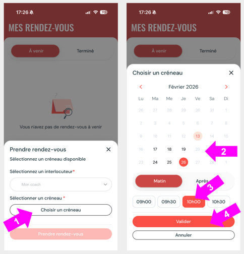 - Cliquez sur "Choisir un créneau" (1), sélectionnez la date souhaitée (2), l'horaire (3) et cliquez sur "Valider" (4)