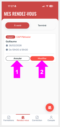 - Votre rendez-vous s'affiche maintenant dans la liste des RDV à venir. Vous pouvez l'annuler en cliquant sur "Annuler" (1) ou le modifier en cliquant sur "Modifier" (2)