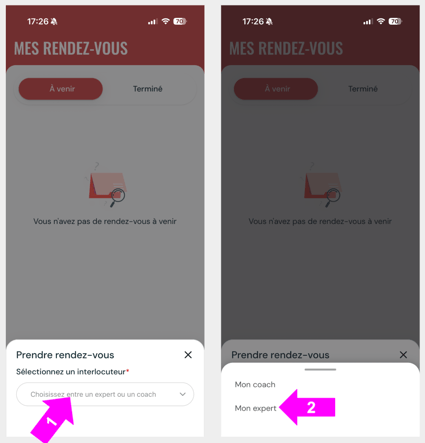 - Cliquez sur "Choisissez entre un expert ou un coach" (1) puis sur "Mon expert" (2)